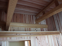 大工の内部造作工事もかなり進行しました。同時に左官工事の漆喰塗りも行われています。2階の二つの子供部屋はロフト部分の板張りと丸太梁が見える山小屋風になりました。